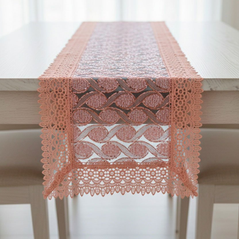 Camino de mesa en lentejuela y encaje, ideal para tus espacios.