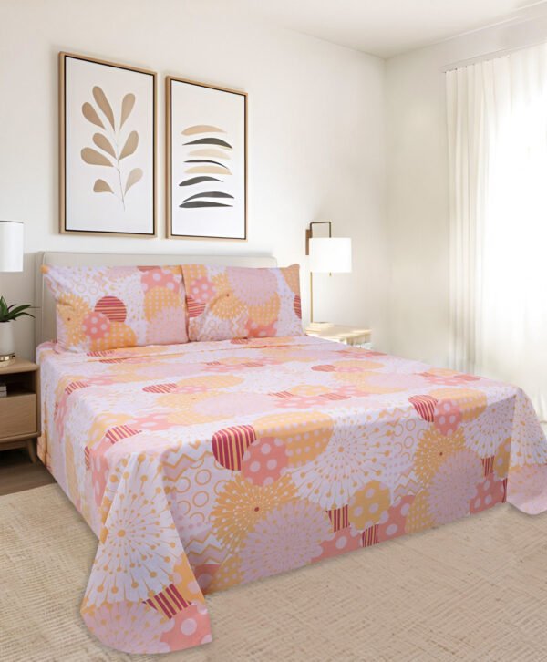 Medida: Para cama de 1,40mtr incluye: 1 sobre sábana de 200cm x 245cm + 1 sábana ajustable de 140cm x 190cm – 30cm de cajón + 2 fundas para almohadas de 50cm x 75cm.