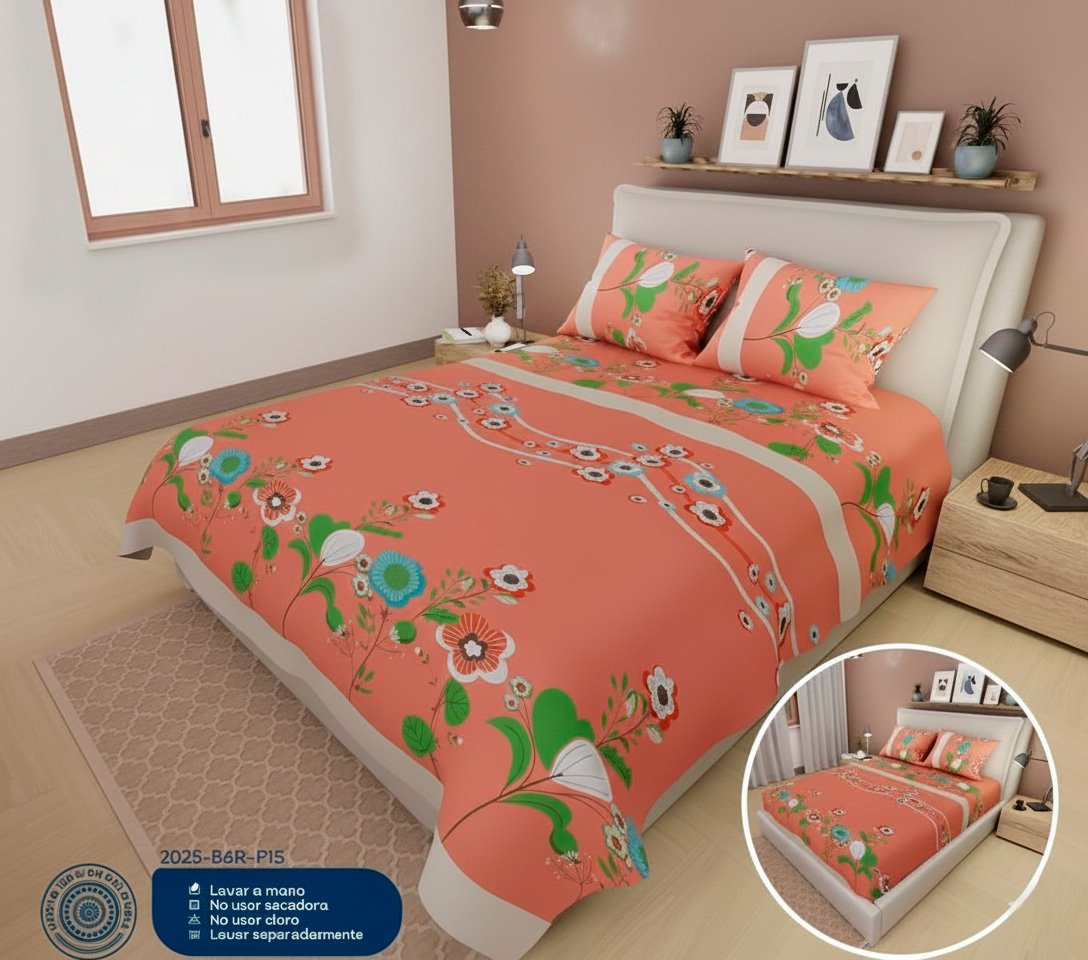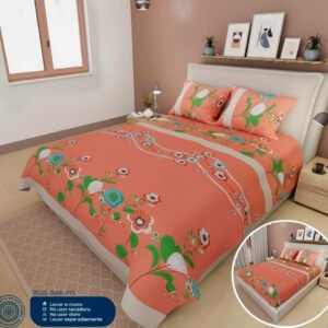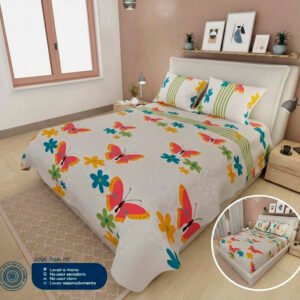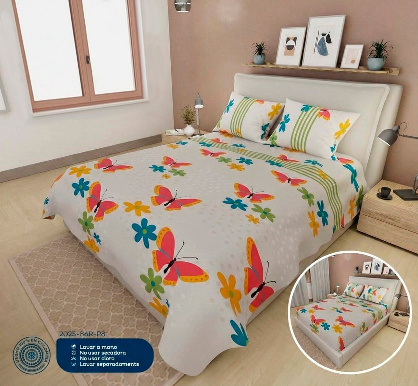 Materia: juego de sábanas en microfibra de 90gr Medida: Para cama de 1,40mtr incluye: 1 sobre sábana de 213cm x 228cm + 1 sábana ajustable de 140cm x 190cm – 20cm de cajón + 2 fundas para almohadas de 50cm x 70cm.
